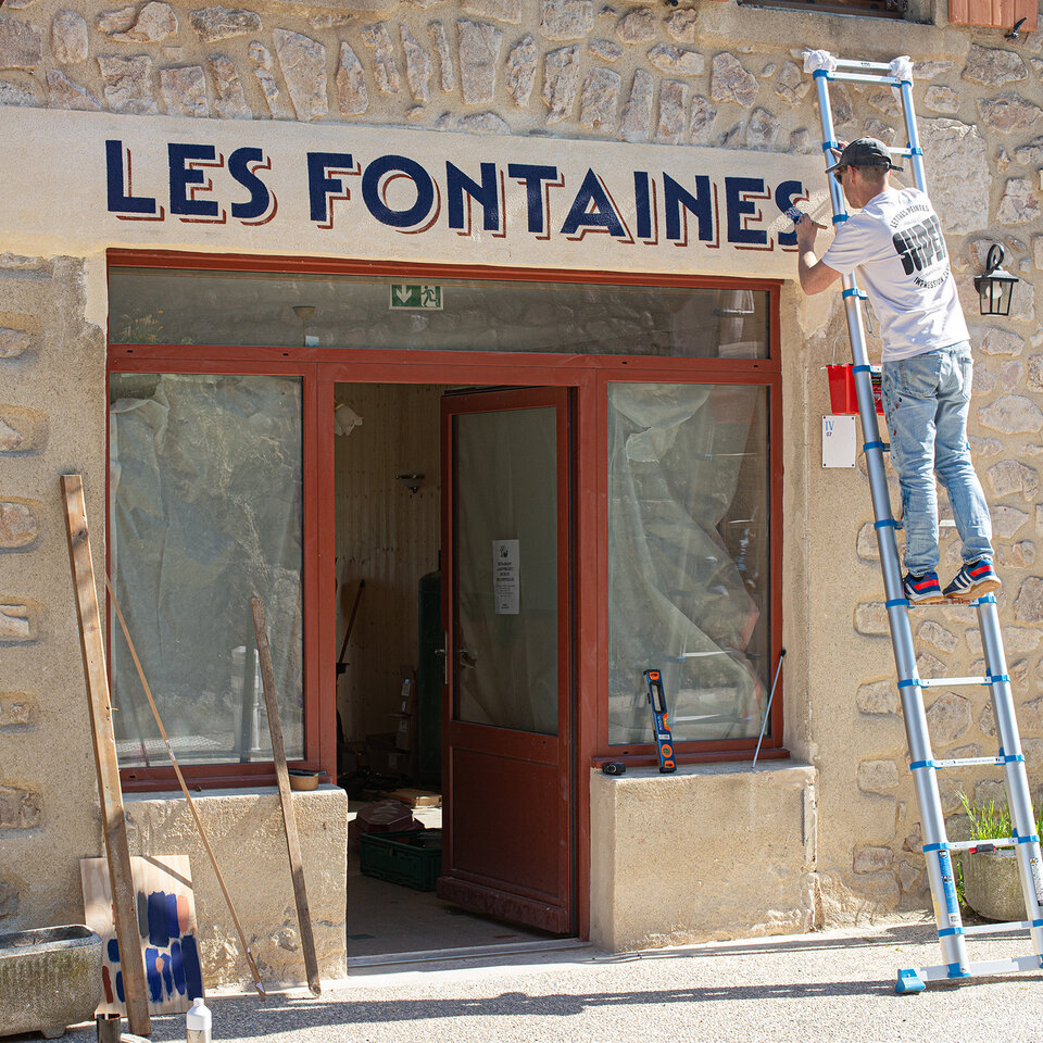 La peinture en lettres est une fabuleuse technique artisanale qui consiste à peindre votre identité visuelle, sur vitrine et devanture, à la peinture émaillée ou la feuille d’or. Ici, ni caisson plexiglas rétroéclairé, ni découpe vinyle, ni intervention allover. Vous gagnez en sobriété visuelle et votre image de marque est valorisée par un travail artisanal pérenne. Super Marché noir vous propose de vous accompagner sur vos projets d’enseigne et signalétique