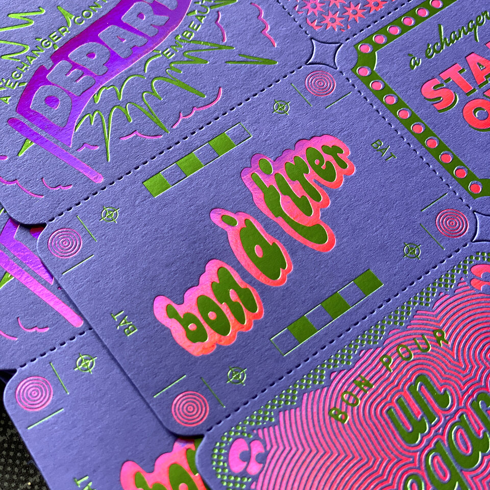 Nous utilisons d’anciennes presses de procédé typographique pour imprimer vos supports les plus soignés. L’emblématique qualité de frappe de ces machines viendra sublimer vos identités visuelles sur de beaux papiers avec des encres Pantone et/ou du marquage à chaud.